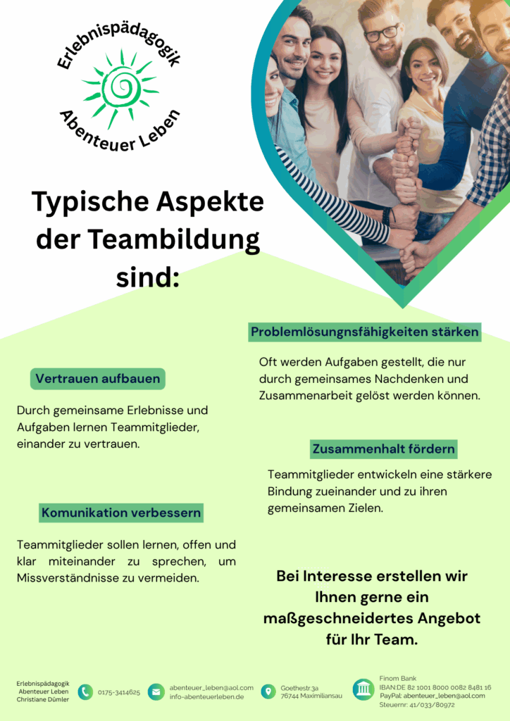 Teambildung bezeichnet den Prozess, bei dem Gruppen von Menschen ( zum Beispiel Arbeitskollegen oder Vereinsmitglieder) durch gezielte Aktivitäten und Übungen ihre Zusammenarbeit verbessern. Ziel der Teambildung ist es, die Kommunikation, das Vertrauen und die Teamarbeit zu stärken, damit die Gruppe effizienter, harmonischer und produktiver zusammenarbeitet.